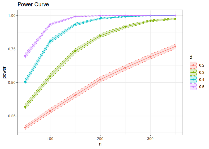 p_t.test() |> SpowerCurve(n=seq(50, 350, by=50), d=c(.2, .3, .4, .5))