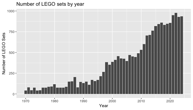 The legosets data frame contains all LEGO sets (n = 20,420) from 1970 through 2024.