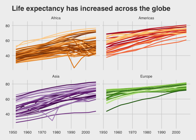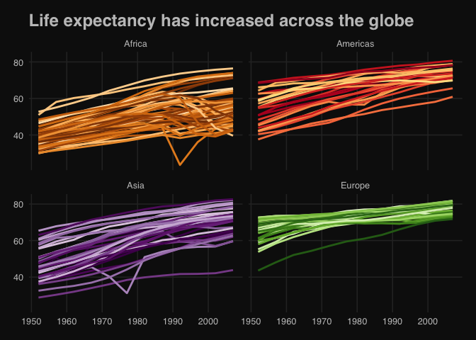 p geom_line(aes(year, lifeExp, group = country, color = country), lwd = 1, show.legend = FALSE) +