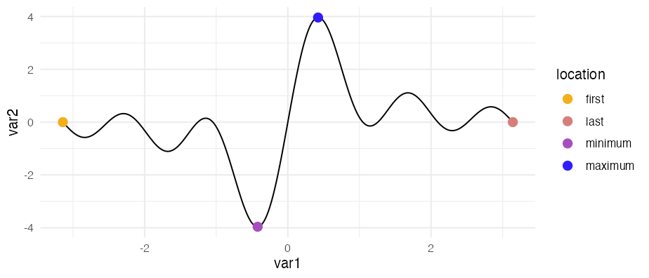geom_pointless() let’s you highlight the first, or last observations, sample minimum and sample maximum to provide additional context. Or just some visual sugar. geom_pointless() behaves similar to geom_point() except that it has a location argument. You can set it to "first", "last" (default), "minimum", "maximum", and "all", where "all" is just shorthand to select "first", "last", "minimum" and "maximum".