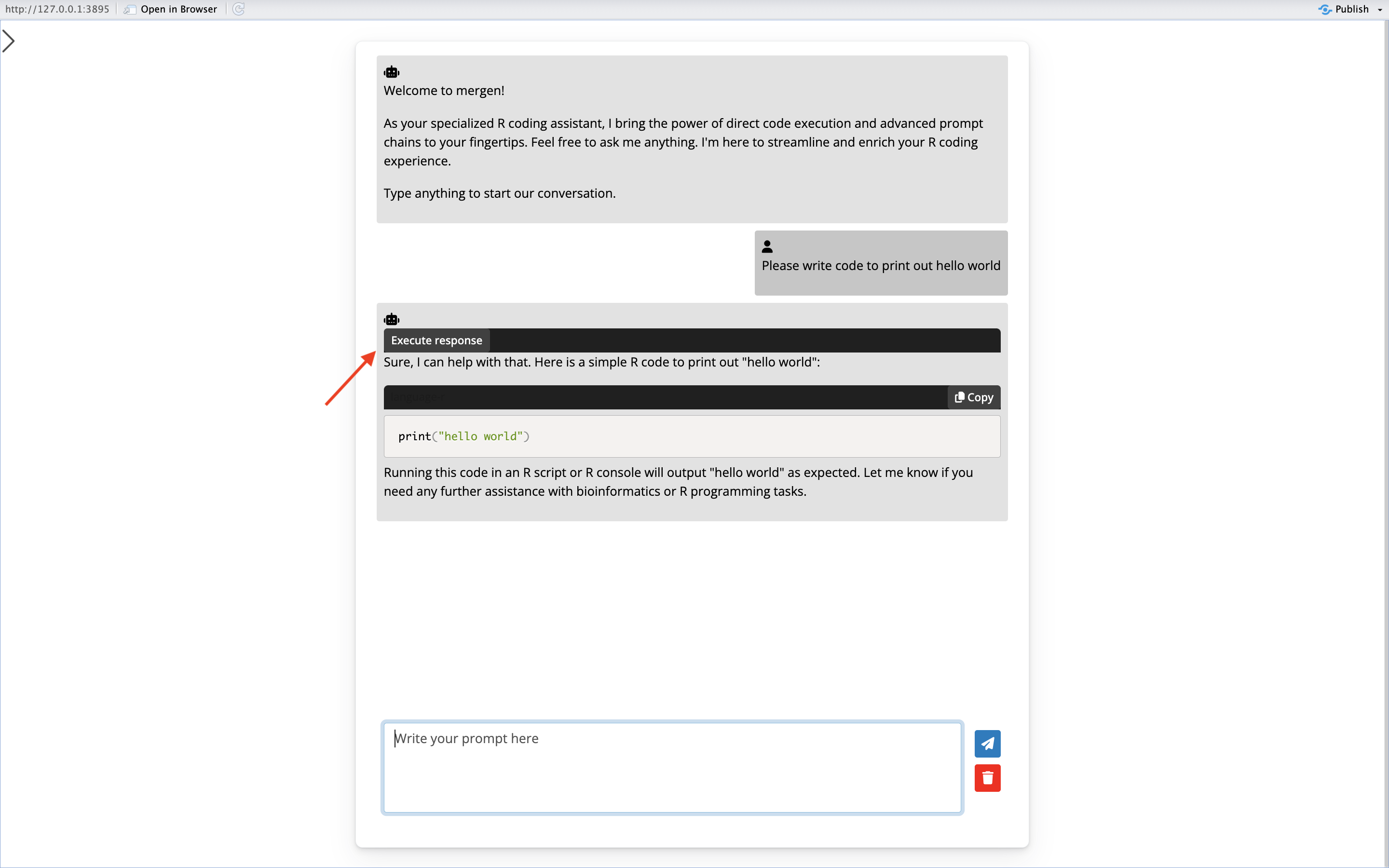 Once you have started chatting with your LLM of choice, any code that might be generated by the LLM can be run directly in the chat interface. To run code from a response, simply press the ‘execute code’ button on top of the response. This will run the code, and show you the output.