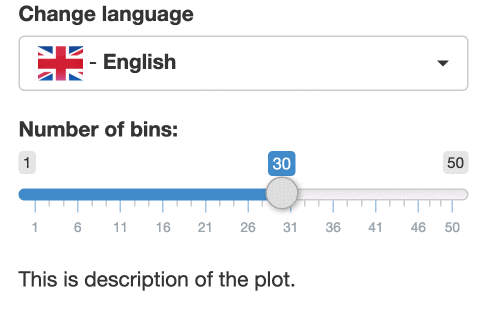 Using it is very simple: just prepare your translation files in one of the supported formats, read them into your app using user-friendly shiny.i18n interface and surround your expressions to translate by a translator tag. Thanks to that your app will remain neat and readable.
