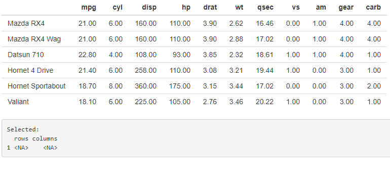 })$tbl <- renderTable(head(mtcars), rownames = TRUE)
