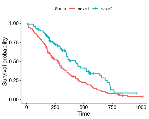 <- survfit(Surv(time, status) ~ sex, data = lung) fit